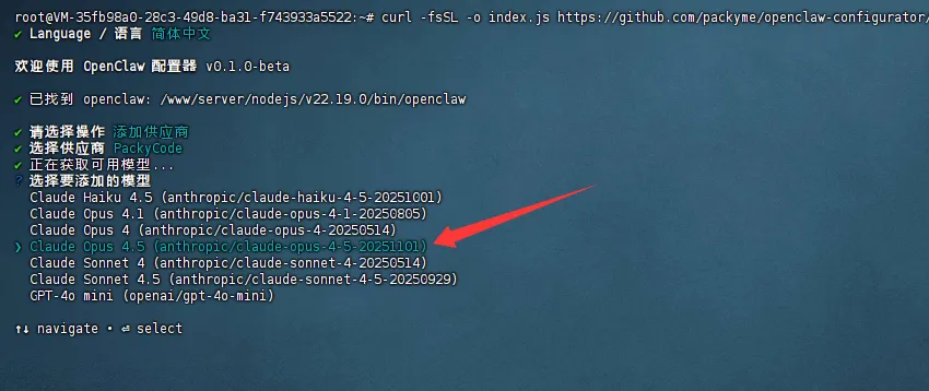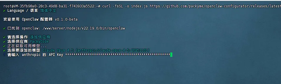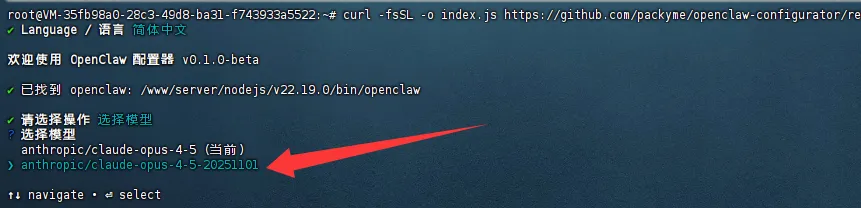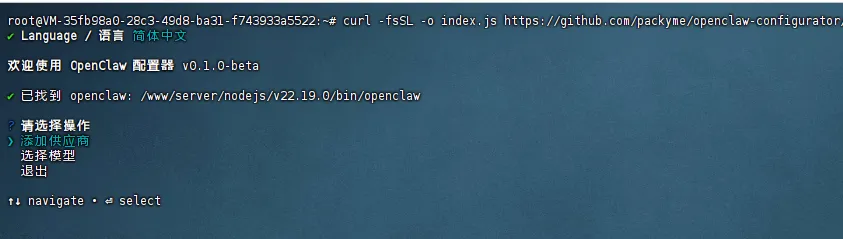 curl -fsSL https://github.com/packyme/openclaw-configurator/releases/latest/download/index.js -o /tmp/openclaw-config.js && node /tmp/openclaw-config.js- 选择