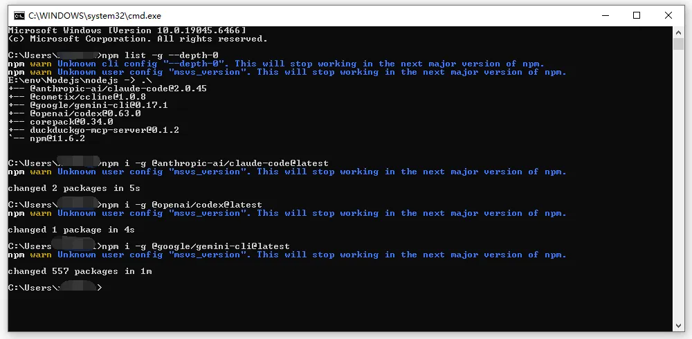 npm list -g --depth-0正常情况应该是如下图所示(没有任何内容也没关系),如果提示“命令未找到”,则说明你没有安装Nodejs,你需要按 此教程 来安装运行Claude Code、Codex、Gemini所需的环境